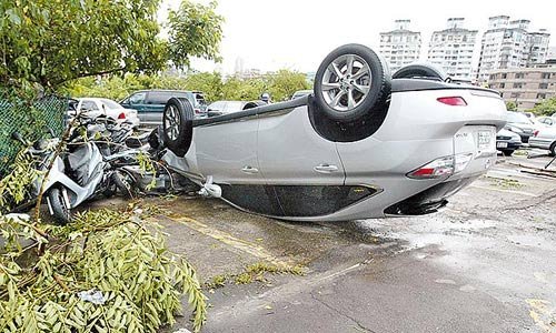 停车场内一辆才买1星期、价值新台币200多万元的Lexus休旅车被吹得四轮朝天。王姓车主的父亲获报到场后无奈地说:“太夸张了啦!为什么会这样子?”