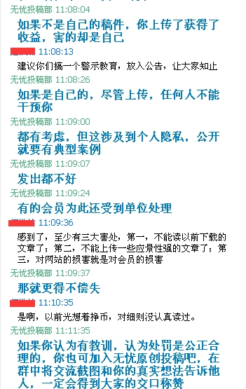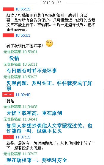 去年加入无忧会员后,从中获益良多。一是自己写作公文搜集资料方便了许多,下载到别人的文章,在深入学习中常常感到茅塞顿开;二是通过原创投稿还赚取了一定的收益,尤其是看到自己的文章被广大客户争相下载后,感到自己的劳动价值得到了极大体现。快乐之余,有时下载的一些个别文章,总有一种“似曾相识燕归来”的感觉,加上自己维权意识不强,总是发出“无可奈何花落去”的感叹!认为一些会员可谓是:网上下来信手拈,挣币全不费功夫!日子久了,自己对这种现象经历了一个“由痛恨、到习惯、再到有意跟风”这样一种心路历程,慢慢把无忧规则忘在脑后。但自己还是想着“兔子不吃窝边草”,从其他网站采集估计没事,因此最近同时发了3篇文章,都是从其他网站采集而来,结果1篇未能过审核,1篇被网站公开,1篇被其他会员投诉。随之我的会员被网站封号了,积分清零,网站第一时间也删除了该篇文章。